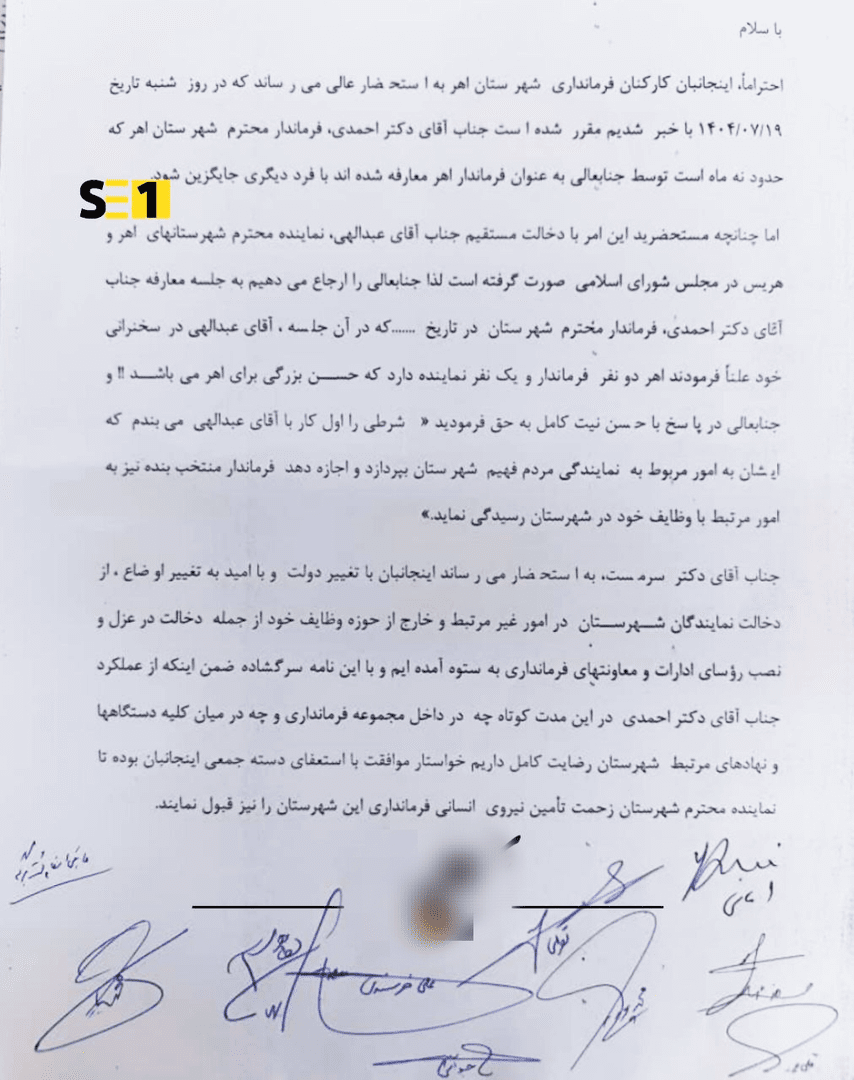 دخالت مستقیم بیت اله عبدالهی نماینده مجلس اهر - هریس در پی برکناری صادق احمدی فرماندار دلسوز و لایق که فقط در طی 9 ماه حضور در فرمانداری اهر با کاردانی و صراحت لهجه لیاقت خود را ثابت کرده و هم جهت نشدن وی با بیت اله عبدالهی باعث برکناری ایشان گردیده کارکنان فرمانداری شهرستان اهر طی نامه ای استعفای دسته جمعی خود را اعلام کردند .